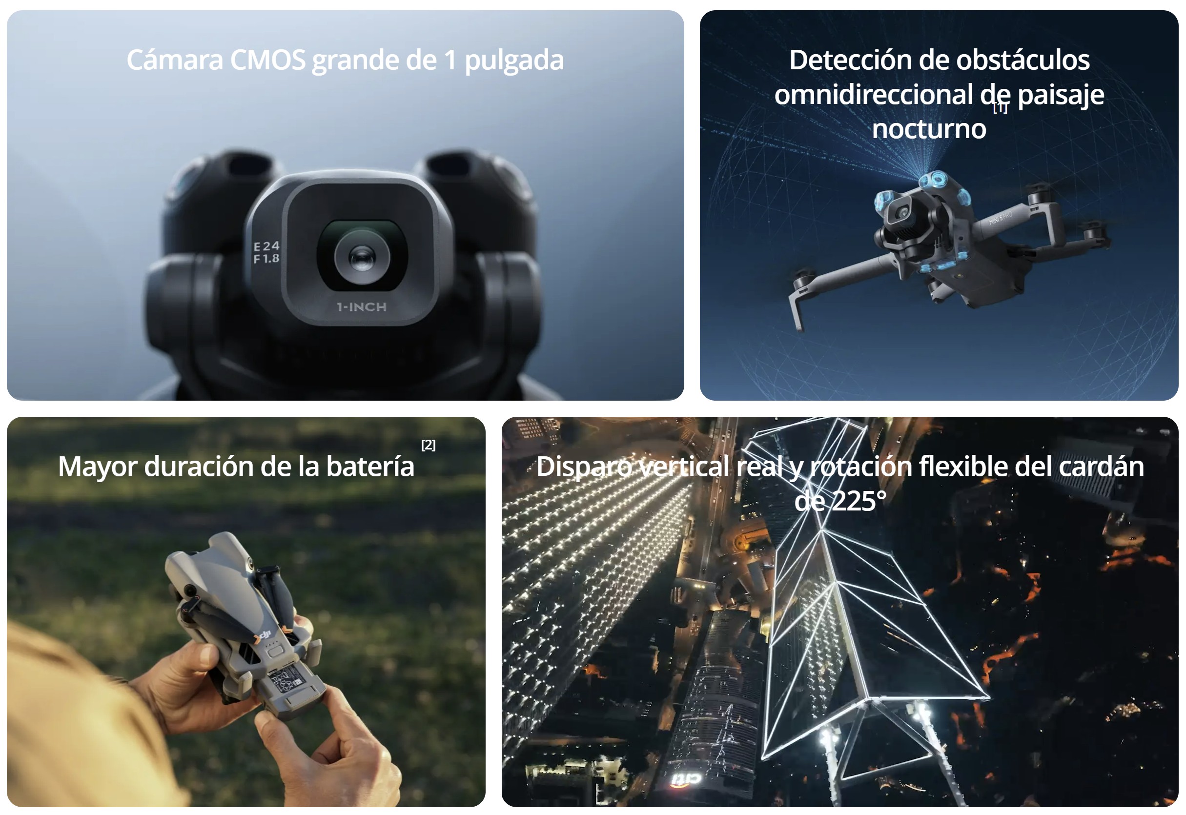 El DJI Mini 5 Pro cuenta con una cámara CMOS de 1 pulgada, detección omnidireccional de obstáculos para paisajes nocturnos [1] , un estabilizador con rotación flexible de 225° y ActiveTrack 360° mejorado, todo ello en su característico cuerpo ligero. Con un rendimiento comparable al de los drones de gama alta, captura los momentos más bellos de la vida y conserva tus recuerdos más preciados con un detalle impresionante.